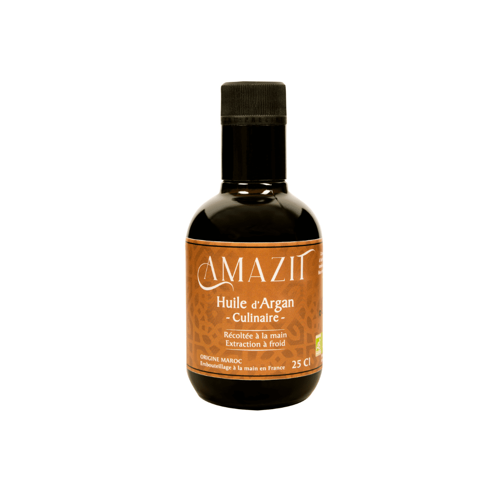 Découvrez notre Huile d’argan alimentaire torréfiée bio | AMAZIT 25cl de qualité supérieure, un produit certifié IGP Argane et Agriculture Biologique par Certipaq Bio (FR-BIO-09). Cette huile est extraite des graines de l’arganier, une espèce végétale rare qui ne pousse qu’au Maroc, et plus précisément dans la Vallée d’Agadir – Province de Taroudant. Notre huile d’argan alimentaire torréfiée bio est produite par une coopérative agricole traditionnelle féminine, qui travaille avec passion pour produire une huile de qualité exceptionnelle.